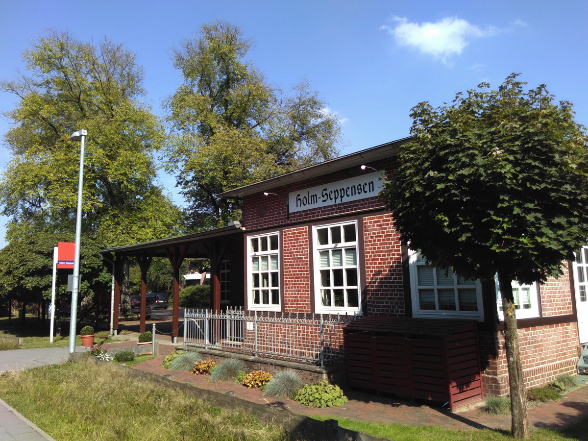Das ehemalige Empfangsgebäude (1901 gab es nur den namengebenden Bahnhof ohne eine Ansiedlung, da sich Holm und Seppensen sich nicht über den Standort einigen konnten) - jetzt nur noch Haltepunkt - beherbergt ein Kulturzentrum und im Keller einen Werkraum für Modellbahner.