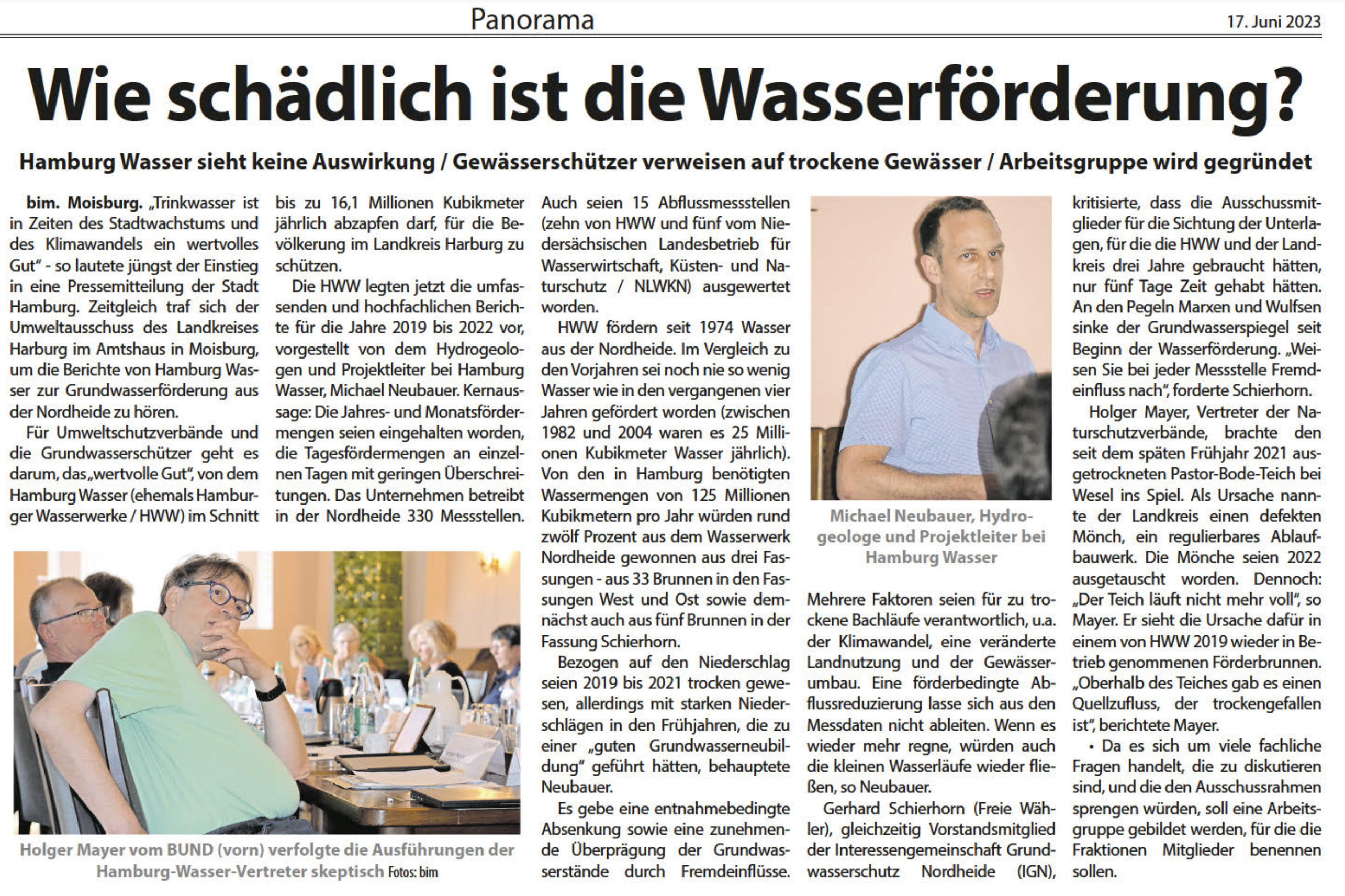 Artikel über Wasserförderung im Nordheide Wochenblatt vom 17. Juni 2023: Wie schädlich ist die Wasserförderung?